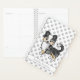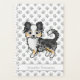 Desteis originelle Cartoon-Illustration eines blauen merle langen Mantel Chihuahua Rasse Hund. Es gibt auch einen personalisierbaren Textbereich für einen Namen oder Titel. Der Hintergrund hat ein hellgraues Muster von Hundepfauendrucken.