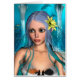 Niedliche Meerjungfrau mit blauem und grünem Haar und gelber Blume auf blauem Fantasy-Hintergrund