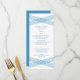 Einfache und elegante Modern Deko Wedding Menu Card mit gestreiftem, kreuz-kreuz geschraftetem Deko Design in blau. Diese klassische Speisekarte kann einfach mit Ihren Hochzeitsdetails angepasst werden. Klicken Sie für weitere Anpassungsoptionen auf die Schaltfläche Anpassen.