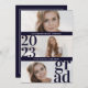 Diese elegante und moderne Abschluss-Einladung ist perfekt für jeden Absolventen. Es verfügt über drei Paneele von Fotos des Absolventen, moderne Typografie und Informationen auf der Rückseite mit einem pinstripe Rand. Die Farbe ist in dunkelmarineblau und weiß gehalten. Es ist modern, cool, einzigartig und stilvoll, das perfekte Design, um es Freunden und Familie zu schicken. ***WICHTIGE HINWEIS FÜR DESIGN: Für jede individuelle Designanforderung, wie z. B. passende Produktanforderungen, Farbänderungen, Platzierungsänderungen oder andere Änderungswünsche, benachrichtigen Sie den Designer. Sie können ihr sogar eine Anfrage für ein komplett individuelles und neues Design schicken.