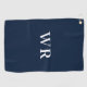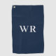 Blaues, modernes Monogramm erstes Golfhandtuch. Einfaches Design mit zwei Initialen auf marineblau Hintergrund. Eine tolle Geschenkidee für den Golfer.