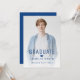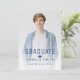 Modern and minimal typography graduation announcements with photo, fun graduation party invitation on the back in blue and white, Custom it with your own photo and party information.