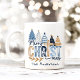 Christliche Weihnachts-Kaffee-Tasse mit Typografie-Design und modernen blauen Weihnachtsbäumen und individuelle Name. Kate Eden Art