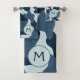 Stilvolles, trendiges, feines, doppelkuhfarbiges, monogramm Set für Badehandtuch in Blautönen. Innerhalb des Kreises befindet sich ein Platzhalter mit blauen Buchstaben, das CUSTOMIZABLE ist, sodass Sie Ihren ersten Buchstaben hinzufügen können. Wenn es an der Zeit ist, die Badezimmerdekoration neu zu gestalten, kann man mit kühnen Kuhflecken sicher nicht falsch liegen... Wählen Sie aus einer großen Auswahl an passenden Geschenken von Berean Designs.
