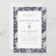 Eine hübsche und elegante Hochzeitseinladung mit einem blumengeschmückten Aquarellhintergrund aus blauen Hydrangeas und Blätter auf dunkelschieferblau/kohlefarbenem Hintergrund, überzogen mit einem doppelten Rechteck. Hochzeitsdetails sind in schieferblauem Holzkohle-Serif-Schriftart. Die Rückseite ist in solidem Licht/staubblauem Blau. Dieses Design würde für eine Winterhochzeit gut funktionieren.