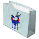 Eine große Geschenktasche mit hellgrünlich blauem Hintergrund. Illustriert mit einem blauen skandinavischen Hirsch mit roten Schals. Mit dekorativen Markierungen auf ihren Körpern.