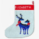 Personalisierter WeihnachtsStrumpf mit hellgrün-weißem, schneeweißem Hintergrund. Illustriert mit einem blauen skandinavischen Hirsch mit roten Schals. Mit dekorativen Markierungen auf ihren Körpern.
