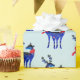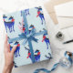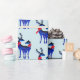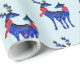 Papier mit einem hellgrünlich blauen Hintergrund. Illustriert mit einem blauen skandinavischen Hirsch mit roten Schals. Mit dekorativen Markierungen auf ihren Körpern. Ein sich wiederholendes Musterdesign.