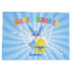 Ein niedlicher, blauer Ostersonniger Cartoon mit einer Nase in Herzform und blauen Augen mit einem gelben Osteroid mit blauem Band und einer farbenfrohen Happy Oaster-Nachricht darüber. Personalisieren Sie das Ausfüllen des Kindernamens oder das Löschen des Textes.