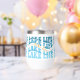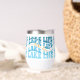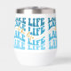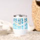 Dieser Weinglastscher ist perfekt für Seehütte oder Bootsbegeisterte. Der blaue Text "LAKE LIFE" wird in verschiedenen Blautönen wiederholt, mit orangefarbenem Drehbuch in der Mitte, das auch "Seebad" sagt. Das Muster wird um den Bereich des Trommel wiederholt und auf einem weißen Hintergrund platziert.