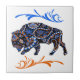 Eine einzigartige dekorative Kachel, die eine künstlerisch mosaikartige Bison-Silhouette aufweist. Das Mosaikmuster hat ein Blumenmotiv in den Farben Royalblau, Orange und Weiß auf schwarzem Hintergrund. Über dem Bisonbild ist ein blauer dekorativer Swirl, darunter ein orangefarbener, passender Swirl.