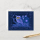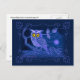 Originelle Blue Owl Art auf Baum Zweig mit Bergen, Nachthimmel, Wolken und Mond mit dekorativer Grenze, auch originell, auf Postkarte.