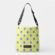 Tasche mit blauen Stiefmütterchen auf gelbem Hintergrund. Hintergrund und Schriftart passen zusammen. Wenn Sie also die Hintergrundfarbe ändern möchten, vergessen Sie nicht, auch den Schriftart zu ändern.