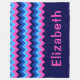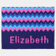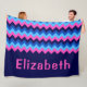 A large sized monogrammed fleece blanket featuring a bright, colorful pattern design of blue and pink chevrons.