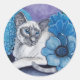 Original Aquarellmalerei von Sandra Gale, mit einem blauen Punkt Siamkatze, umgeben von blauen Blumen auf einem blassgelben lila Hintergrund. Blume sind blaue Hydrangea und blaue Mohn. Das Design ist perfekt für Katzenliebhaber und diejenigen, die die siamesische Rasse besonders mögen. Ideal für Schlafzimmerwandkunst oder gerahmt mit passendem Bild. Die passende Aquarellmalerei eines Schokoladenpunktes Siamese ist ebenfalls verfügbar.