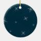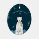 Adorable erste Weihnachtsschmuck mit einer Illustration eines kleinen Eisbären mit seiner schützenden Mutter auf einem dunkelblauen Hintergrund mit weißen Schneeflocken. Illustriert und entworfen von Patricia Alvarez.