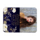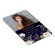 Wählen Sie diese englische Version oder die spanische Version, auch in dieser Sammlung, für ein schönes Save the Date für eine Quinceanera mit Foto, Name und Datum, erstellt in einem schönen Blumenmotiv in Marineblau, Weiß und Imitat goldenen Akzente.
