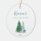 Blue Bunny Rabbit Baby's First Christmas Custom Name Round Ceramic Ornament — The precious personalized xmas ornament template features an adorable watercolor rabbit, standing beside a festive christmas tree with lovely wrapped gifts. The text boxes allow for easy customization of any baby's name in a handwritten calligraphy script font, and birth year in a simple, minimalist sans serif. Both sides of this personalizable, gender neutral keepsake tree decoration are identical.
