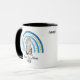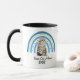Hier ist eine niedliche Tasse für die beste KatzenMama. Ein bezauberndes Bild einer grauen und weißen Maine Coon Katze sitzt vor einem blauen und goldenen Herzboho-artigen Regenbogen. Unten steht schwarzer Text mit der Aufschrift "Beste Katze Mama je". Das Bild wird zweimal auf der Tasse gedruckt, wobei ihr Name oben schwarz auf der steht. *Wenn Sie eine andere Katzenfarbe auf dieser Tasse wünschen, besuchen Sie unbedingt unseren Shop!