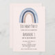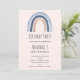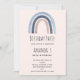 Eine Geburtstagseinladung mit einem niedlichen und skurrilen Regenbogen. Blau und Pfirsichfarben.