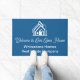 This professional realtor doormat is custom made with your real estate company name under the modern welcome in white cursive script for an open house. This chic custom blue realty business decor features a house logo image for home builder or realty agent company marketing.