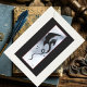 Schwarzer Stammdrache mit blauer grauer Kulisse mit kleinen roten Blume und roter Grenze