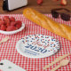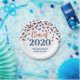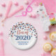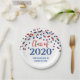Maßgeschneiderte Graduiertenklasse von 2020 Tellern in Weiß mit glamourösen roten und blauen Konfetti-Mustern. und eleganter handgeschriebener Stiltext.
