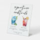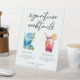 Dieses schicke Cocktails-Podest mit schwarzer Typografie über 2 Meeresgetränken und deren Zutaten für Ihre Hochzeitsfeier am Strand. Ein niedlicher Blue Lagoon und Dirty Shirley oder ein Kirschgetränk zeichnend fügen einen coolen Flair zu Ihrem Bar Menü. Füllen Sie bitte die Namen des Paares und das Datum für seinen Empfang aus.