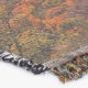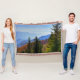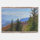 Eine ruhige Berglandschaft mit sanften Hügeln, die mit einem lebhaften Herbstdach geschmückt sind, schafft einen farbenfrohen Wandteppich gegen die entfernten, nebelbedeckten Gipfel. Große immergrüne Bäume umrahmen den Vordergrund und verleihen dem atemberaubenden Ausblick Tiefe.