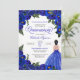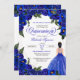 Quinceanera Einladung in königsblaue Rose mit goldenen Akzenten und ein Mädchen mit elegantem Ball-Gown. Karo den Shop für diese Einladung mit Mädchen in verschiedenen Haarfarben und Hautfarben.