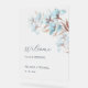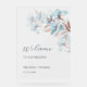This elegant wedding welcome board features layered dimensional blue and gold flowers on a transparent background.