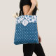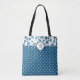 Der untere Teil dieser Tasche hat ein hübsches blau-weißes Polka-Punktmuster. Oben ist ein Band mit blauer Rose auf weißem Hintergrund. Die beiden Abschnitte sind durch dünne dunkelblaue Streifen und ein verziertes Banner mit eigener Monogramm getrennt. Die Rückseite der Tasche hat das gleiche Polka Dot Design mit dem Blumenband, aber ohne Banner oder Monogramm. Wunderschön für Frühling und Sommer, und personalisiert für Sie!