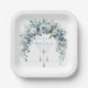 Elevate your celebration’s dining experience with these stunning Blue Rose & Silver Cross Baptism Paper Plates. Each square plate features a majestic overhead arch of watercolor roses in dusty blue and crisp white, complemented by soft eucalyptus and greenery. Suspended from the center of the floral display is a delicate silver filigree cross with cascading metallic chains and tassels, creating a refined, boutique-style aesthetic.