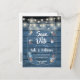 Verfügt über Saitenleuchten über einem künstlerischen Mauerkessel, der mit personalisierten Save the Date Details gefüllt ist und verstreute delikate Blume auf blauem rustikalem Holzpaneelhintergrund. Die Rückseite hat zusätzliche Save the Date Details, einschließlich Ihrer Hochzeitswebsite, mit Ihrer Rücksendeadresse und Platz für die Adresse Ihres Empfängers. Entwickelt von Thisisnotme©