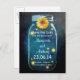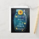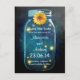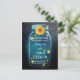Whimsical Rustic Blue Mason Jar Save the Date Postkarten, mit einem nächtlichen Himmelshintergrund, fliegenden Glühwürmchen und schmutzigen Akzent.