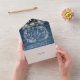 Alles in einer Hochzeitseinladung mit hübschen Saitenlichtern, handgezeichnet Blumengarten und schicker Typografie auf blauen rustikalen Holzpaneelen. Die Einladung enthält eine perforierte RSVP-Karte mit Ihrem Hochzeitswebseiten QR Code und Details. Entwickelt von Thisisnotme©