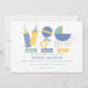 Dieses lustige Design mit niedlichen Abbildungen von Flaschen, einer Rasse und einem Babywagen, in einer süßen Farbpalette von blau, grün und gelb, macht eine schöne Babydusche-Einladung.