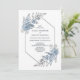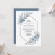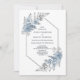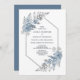 Eine elegante botanische Hochzeitseinladung in Blau und Silber mit Farn-Blätter und Gänsebläschen, die von einem einfachen Imitat-Glitzer-Wireframe gehalten werden. Sowohl die Zeremonie als auch die Anschrift des Empfangs wurden in die Einladung aufgenommen.