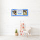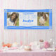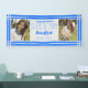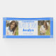 Hang dieses Blue Silver Geometric Two Fotos Abschluss Banner, um Ihren Absolvent zu feiern. Personalisieren Sie mit zwei Fotos, Name, Schule und Jahrgang. Dieses Banner der Schulfarbenklasse 2024 zeichnet sich durch femininen Schriftart und einen dekorativen silber-blauen Rahmen aus.