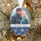 Dieses hübsche Urlaubssake-Ornament zeigt Ihr eigenes Foto, mit einer Unterseite eines silbernen Schneeflockenmusters auf dunkelblau. Ein silbergraues Banner hält Ihren personalisierten Text in passendem Blau. Die Rückseite des Ornaments hat das gleiche blaue und silberne Schneeflockenmuster mit einem zusätzlichen Textfeld. Das macht ein schönes Sake-Geschenk für frisch vermählte oder ein Paar. *Tipp zum Platzieren Ihres Fotos — nach dem Hochladen verwenden Sie "Anpassen" und die Pfeiltasten, um es für das beste Aussehen zu verschieben.*