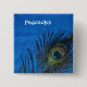 Brillante Pfauenfeder vor blauem Hintergrund. Passen Sie die Pfau-Objekte mit dem Namen Ihres Kindes oder mit etwas anderem an. Diese phantastische Pfauenfeder wird ein großartiges Geschenk machen.