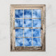 Ein schöner blauer Himmel voller Wolken hinter einem alten verfallenden Fenster.