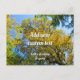 Eine Postkarte, die eine ruhige Herbstszene mit gelben Bäumen und ihren sonnenbeleuchteten Blätter zeigt, die sich wunderbar gegen einen klaren, blauen Himmel kontrastieren. Diese Postkarte bietet die Möglichkeit, die Vorder- und Rückseite mit einem Gruß, einer Rücksendeadresse, Ihrer Nachricht und dem Namen und der Adresse des Empfängers zu personalisieren. Sie können sie auch leer verlassen, wenn Sie lieber handschreiben. LAGE: Kings Wood, Challock, Ashford, Kent, England, Großbritannien.