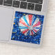 A colorful aerostatic hot air balloon seen from below sits against a deep blue, starry background. The design is vibrant with red, white, and blue segments, surrounded by scattered small yellow and white accents.