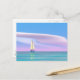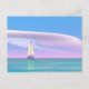 Postcard mit meinem digitalen Kunstwerk eines Segelbootes auf einem ruhigen türkisfarbenen Wasser mit wavy Wolken, blauem Himmel und rosa Horizont.