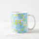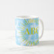 Der Sonnenstrahl zeichne mit Monogramm. Maßgeschneiderte Kaffeetassen. Blaues Himmelsmuster im Hintergrund. Bearbeiten Sie die Initialen, um es zu einem personalisierten Produkt zu machen, behielte Sie es als 3-Buchstaben-Monogramm oder machen Sie daraus ein 2-Buchstaben-Monogramm. Geschenke Idee für Menschen aller Altersgruppen, die Liebe Kaffee.