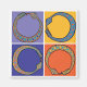Vier blaue Schlangen beißen ihre Geschichten auf diesen blauen, roten und orangen Quadraten.