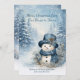 From Our House to Yours - A softly illustrated winter scene features a charming snowman dressed in cozy shades of blue, standing among snow-covered evergreen trees as gentle snowflakes and sparkling lights drift through the air. Delicate winter foliage surrounds him, and the cool, peaceful palette of icy blues and whites creates a calm, nostalgic holiday atmosphere. The glowing snowfall and serene forest setting evoke comfort, joy, and heartfelt connection, making this image a timeless expression of the magic of Christmas. Personalize with your own information.