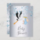 Elegante, klassische, glamouröse Babydusche, die einen kleinen Jungen feiert. Blau leuchtende Sterne und ein fliegender Storch, Vogel hält einen kleinen Jungen. Imitate silber metallisch aussehender Hintergrund. Mit dem Text: Babydusche vorne geschrieben mit einem modernen, dunkelgrauen Handschrift in Handschrift. Fügen Sie Ihre Veranstaltungsdetails in hintere, dunkelgraue Buchstaben ein.