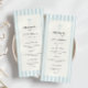 Elegante Taufkarte mit hellblauen und weißen Streifen und einem einfachen Kreuz auf Elfenbeinhintergrund.